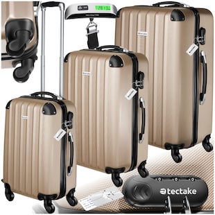 tectake® 3er Kofferset, 3-teilig aus robustem ABS-Kunststoff inkl. Kofferwaage und -anhänger, 360° drehbare, abnehmbare Rollen, mit Sicherheitszahlenschloss -22 % Sie Sparen 22 Prozent, UVP 109,00 UVP : 109,00€ 84,99* Aktueller Preis: 84,99€ Sternchen Fußnote, Details am Seitenende