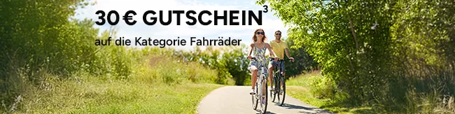 ³30 € Rabatt auf die Kategorie Fahrräder mit dem Code: M-BIKE-30, ab einem Mindestbestellwert von 999 €. Nur online gültig von 26.03.2026 bis 30.04.2026. Ausgenommen: Gutscheine sowie einzelne, entsprechend gesondert gekennzeichnete Artikel bzw. ausgewählte Werbeware. Keine Anrechnung auf Versandkosten und Filial-Abholservices. Nicht mit anderen Aktionsvorteilen (PAYBACK oder sonstige Shop-Aktionen) kombinierbar.