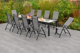 DEGAMO Garnitur PISA 9-teilig, Aluminium silbergrau + Glas + Kunstgewebe schwarz nur 679,00* nur 679,00€ Sternchen Fußnote, Details am Seitenende