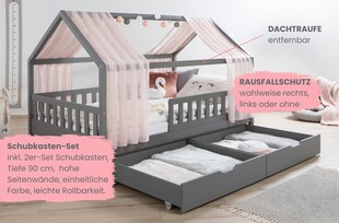 TiCAA Hausbett mit Tüll Kim 90x200 cm, 100x200 cm, 120x200 cm, 140x200 cm für Jungen & Mädchen, inkl. Rolllattenrost, Schubkasten und Rausfallschutz variabel, Hellgrau aus Kiefer Massivholz -26 % Sie Sparen 26 Prozent, UVP 619,90 UVP : 619,90€ ab 457,51* ab 457,51€ Sternchen Fußnote, Details am Seitenende
