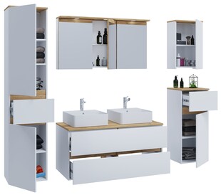 VCM 7-tlg. Doppelwaschtisch Cosila mit 2 Keramikbecken – Badschrank H. 51 x B. 111 x T. 51 cm mit 2 Softclose-Schubladen, Spiegelschrank mit Beleuchtung & Steckdose, Midi und Hängeschrank, Waschplatz Set Cosila-A nur 1.079,00* nur 1079,00€ Sternchen Fußnote, Details am Seitenende