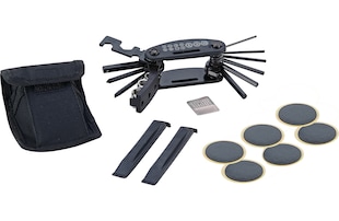 Fahrrad Reparatur-Set, mit Multifunktionswerkzeug mit 15 Funktionen, 2x Reifenheber, 4x selbstklebende Flicken, 1x Aufrauher, 1x Gürtel-Tasche nur 16,99* nur 16,99€ Sternchen Fußnote, Details am Seitenende